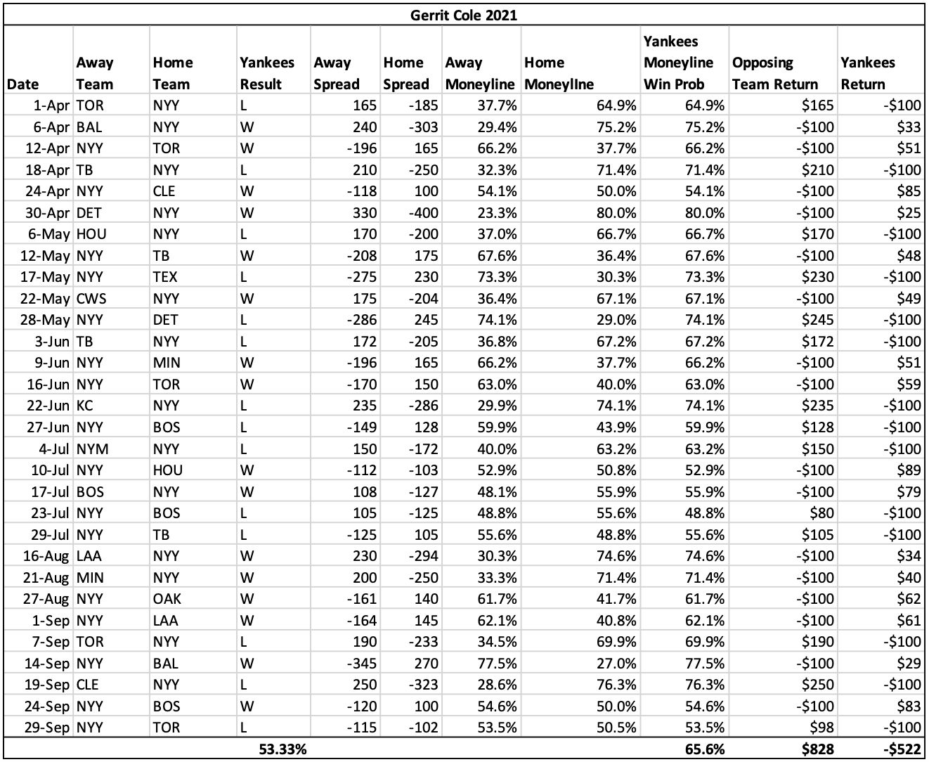There’s no doubt that Gerrit Cole is an elite pitcher playing for a great team, the New York Yankees. He finished second in the AL Cy Young award in 2021 with a 3.23 ERA, however, Vegas bettors seemed to think that the Yankees were a better team with Cole on the mound than they really were. According to the Vegas opening moneyline consensus, the Yankees had an average win probability of 65.6% when Cole pitched in 2021 and sometimes a win probability as high as 80%. Seven times throughout the season, our model at Game Wagers{:target="_blank"} found positive edge betting against the Yankees when Cole was on the mound. At first glance, it seems counterintuitive to bet against a name like Cole, so we analyzed our picks and found that our Game Wagers model had positive return against Cole.