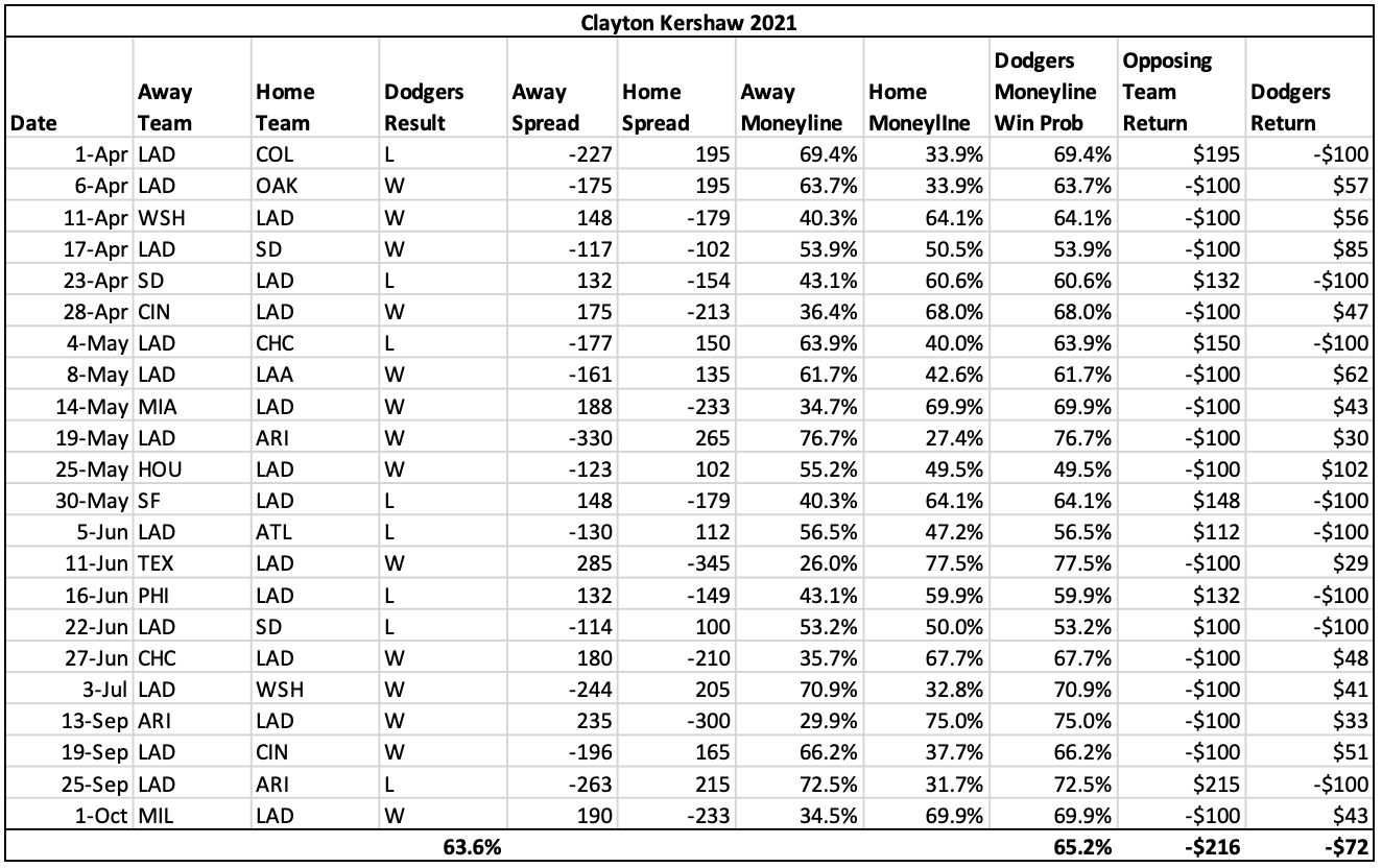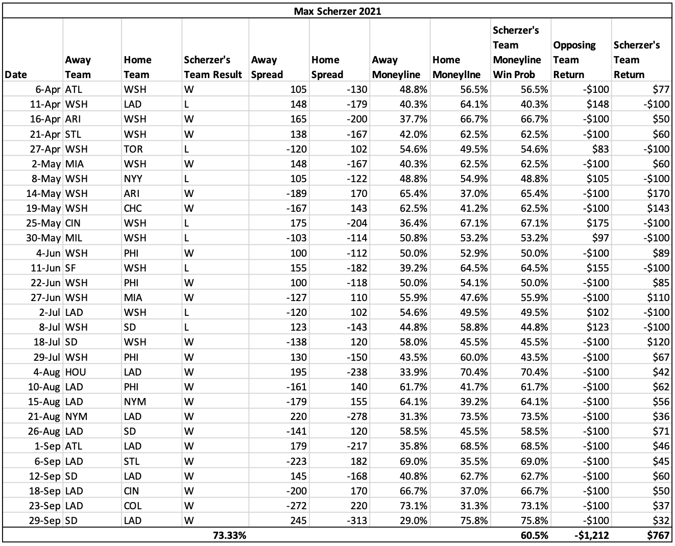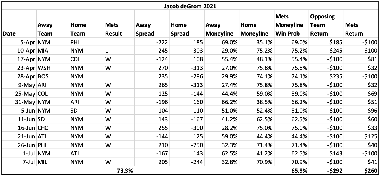 To dig deeper into whether this was a one off for an elite pitcher, we also looked into Clayton Kershaw, Max Scherzer and Jacob deGrom for their 2021 starts and found a positive return. In fact, had you taken every regular season game that these four pitchers started (including Cole), you’d have finished +4.3 units over 97 games for an ROI of 4.46% and had you taken the opposing team in all 97 games you’d have finished -8.9 units. For both Scherzer and deGrom, the evidence shows that the Vegas money was actually undervaluing their starts.